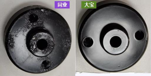 大宝漆与同业水性黑色哑光金属烤漆在锌合金素材上耐盐雾500小时对比测试结果: