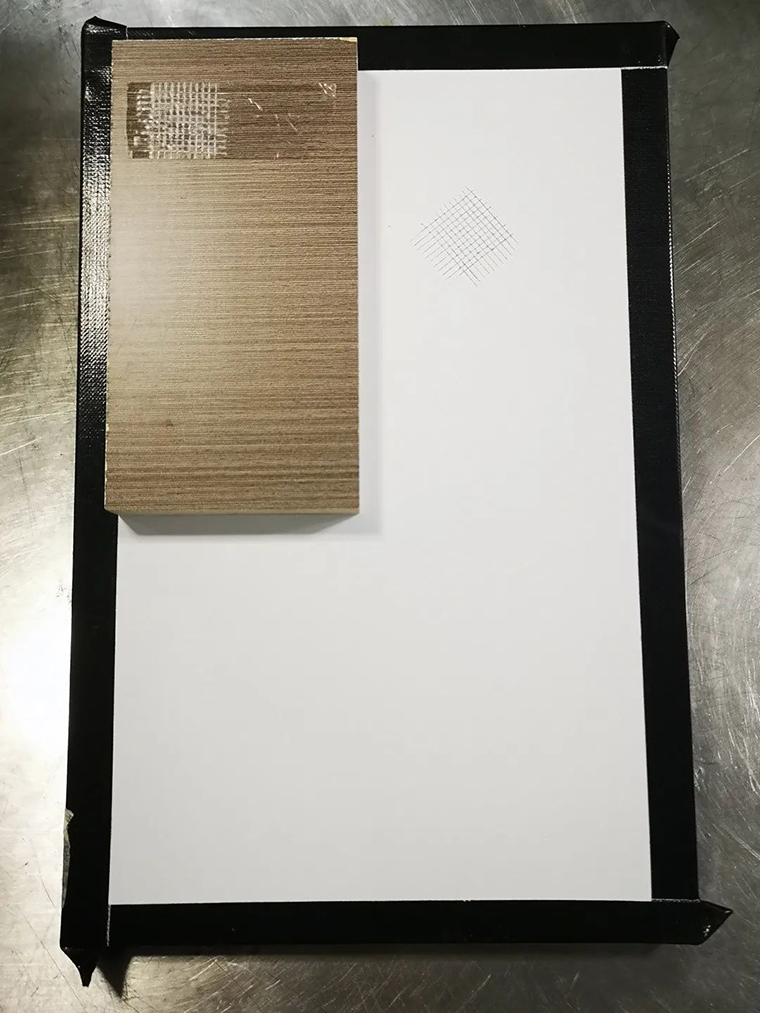 样板10cm *15cm喷涂两道110g/㎡,漆膜完全干燥后堆迭,放一个重压槌(≒706g)在50℃下烘烤4hrs,取出冷却分离,不可伤及漆膜。