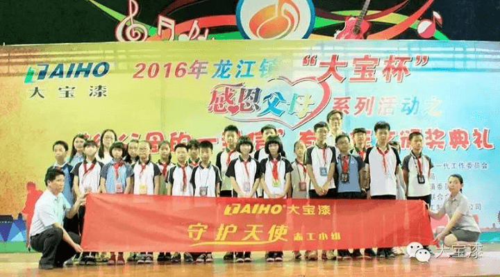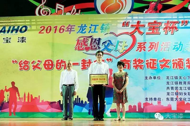 5月20日,由佛山龙江镇教育局、龙江镇关心下一代委员会与大宝漆共同主办的2016年龙江镇“大宝杯”感恩父母系列活动之“给父母的一封信”有奖征文颁奖典礼在龙江镇城区中心小学举办。佛山龙江镇教育局和龙江镇关心下一代委员会在颁奖典礼上授予大宝漆“博爱慈怀热心公益”称号。大宝化工企划部杨忠荣副理、龙江镇关心下一代工作委员会麦焕桥主任、获奖小学生及其家长出席了本次颁奖典礼。