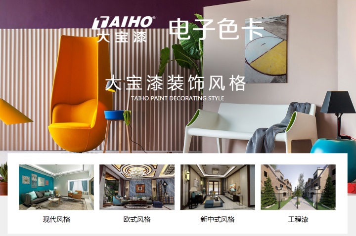 大宝漆在线配色电子色卡体验系统,主页风格模块包括现代风格、欧式风格、新中式风格、工程漆,在这里你可以根据居家户型、装修风格、个人喜好选择色彩、产品,随心组合搭配,就能立即看见“实装效果”,全方位满足消费者不同程度的色彩和涂装服务需求。