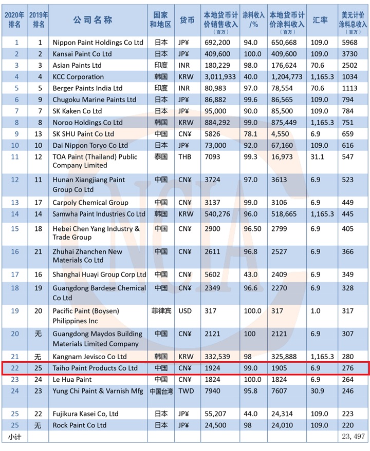 2020亚太地区涂料生产商TOP 25榜单