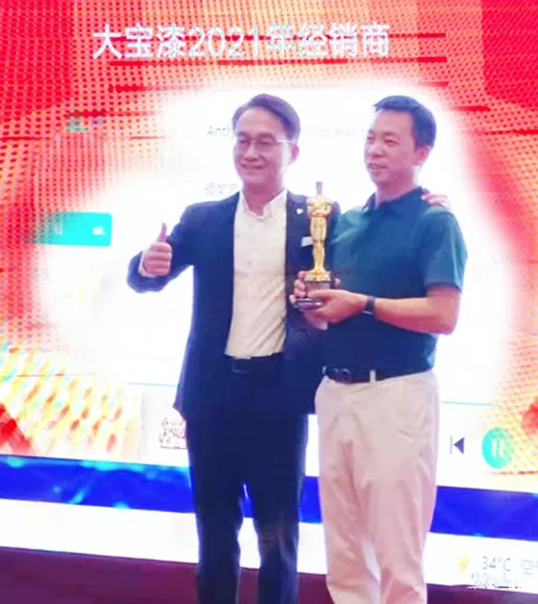 会议伊始,经销事业部叶子琛副总经理为不忘初心、始终坚守,专心经营大宝漆的武汉宝塔商贸李军总经理(以下简称李总)颁发特别感恩奖,对20多年来用心经营大宝漆的李总所做的贡献给予高度肯定和感谢。