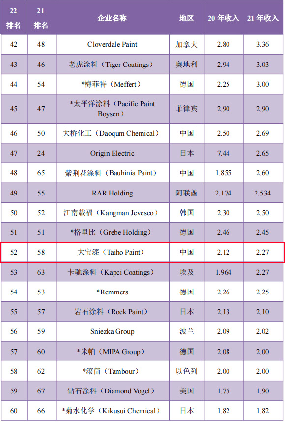 2022全球涂料制造企业排行榜(大宝漆位列52名)