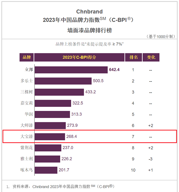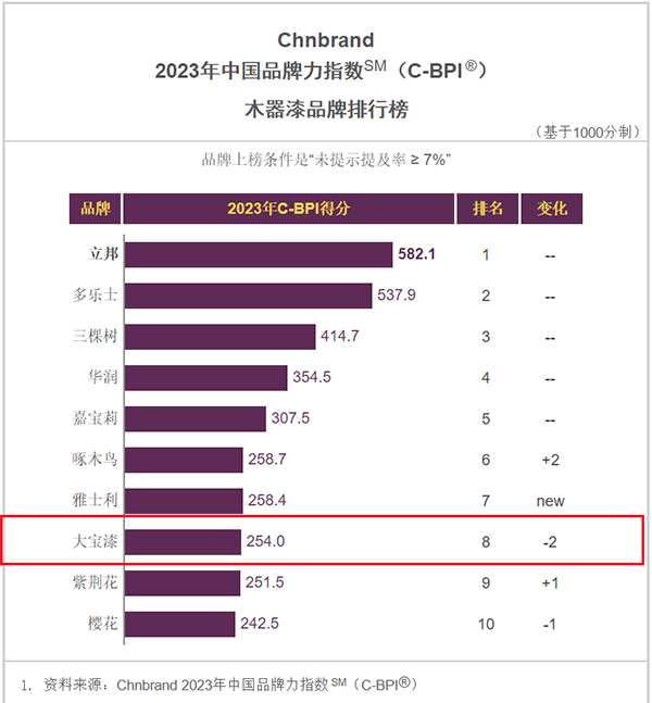 4月18日,品牌评级机构Chnbrand发布2023年第十三届中国品牌力指数sm(C-BPI)品牌排名,大宝漆再度上榜“墙面漆品牌排行榜”、“木器漆品牌排行榜”双榜单,彰显品牌影响力。