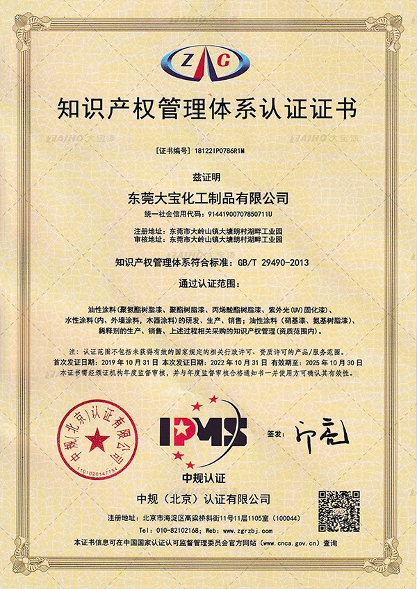 4月26日,是第23个世界知识产权日,大宝化工再次通过国家企业知识产权管理认证,是对大宝化工近年来取得创新成果的肯定,同时也标志着大宝漆在知识产权创造、运用、管理和保护方面具备领先水平。