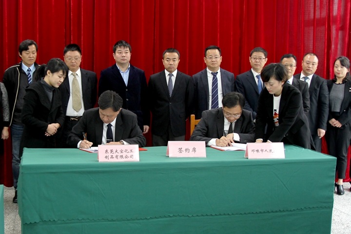 大宝国际董事长陈贺生与邛崃市副市长周洪彬代表双方签约