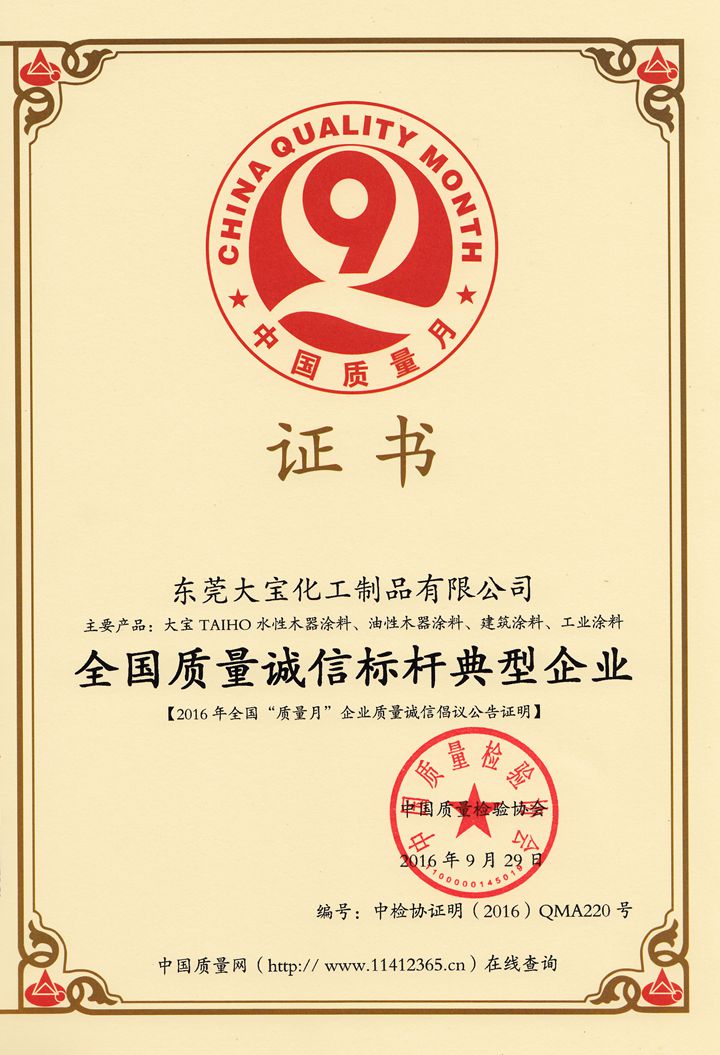 9月29日 西西影视,中国质监总局,中宣部,发改委,教育部,科技部,工业和信息化部,环境保护部等42个相关部门,行业协会,共同主办的2016年全国“质量月”活动中,大宝化工凭借过硬的革新技术,产品质量,服务理念,再次荣获“全国质量诚信标杆典型企业”称号,并由中国质量检验协会授予相关证明证书, 。