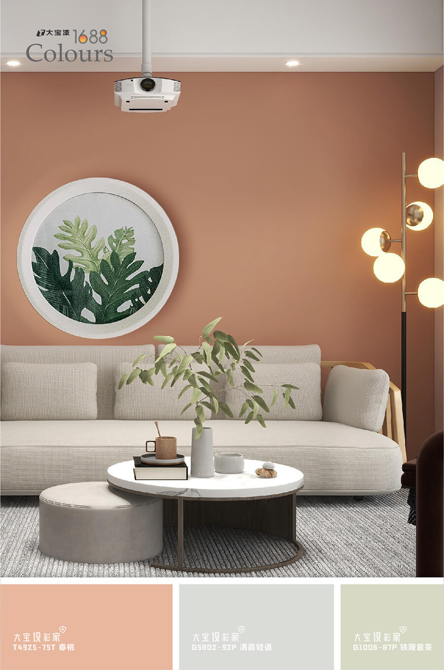 低饱和的色调度,将家居空间中大面积填铺,大宝春桃橘(T4925-75T)的与众不同,在于浓而不烈,刚柔相济,与雾霾灰沙发,大理石纹茶几 免费西西影视,金属灯饰等材质搭配起来,达到冷暖色系之间的平衡,利用大宝涂料,创造出有灵魂的空间, 。